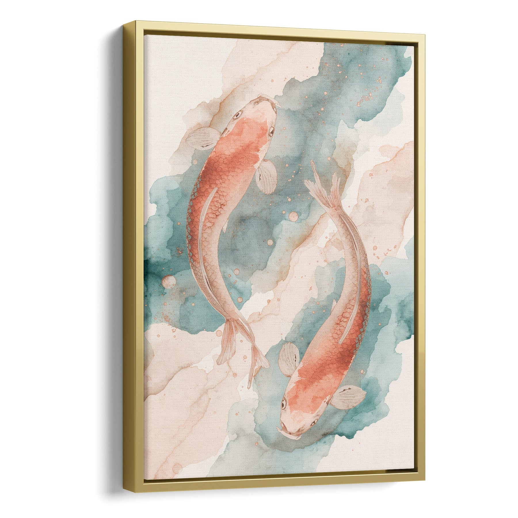 Immerse your space in tranquility with this captivating watercolor print featuring two gracefully swimming koi fish. The harmonious blend of soft coral, peach, and muted teal hues creates a soothing and elegant visual experience. Perfect for creating a peaceful ambiance in a living room, bedroom, or spa-like bathroom, this piece adds a touch of natural harmony to any wall.