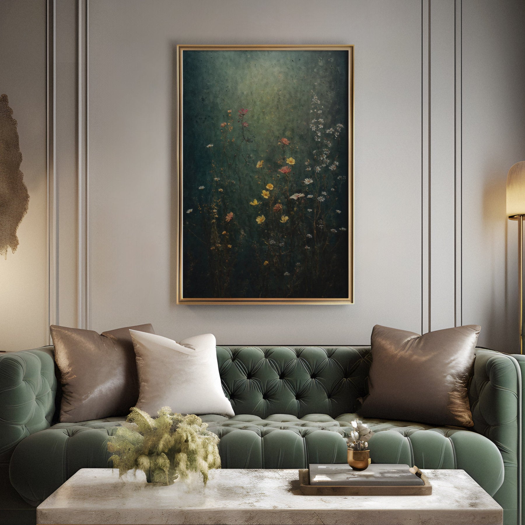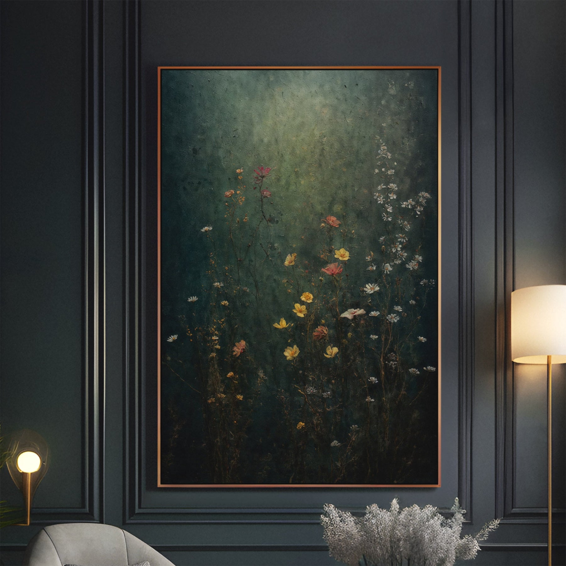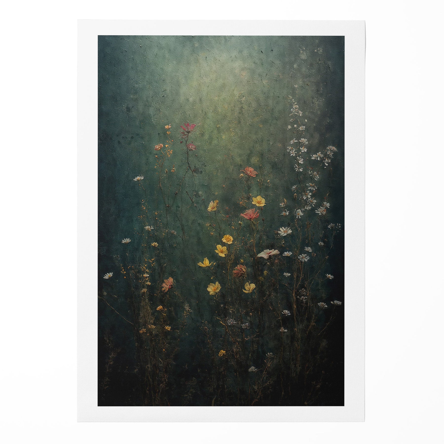 This captivating gallery-grade print features delicate wildflowers emerging from a deeply textured, moody green background, evoking the feeling of a misty twilight garden. The abstract, painterly style combines soft hues of pink, yellow, and cream, creating a serene and nostalgic atmosphere. It is an ideal piece to bring a touch of sophisticated, organic beauty to a bedroom, living room, or study.