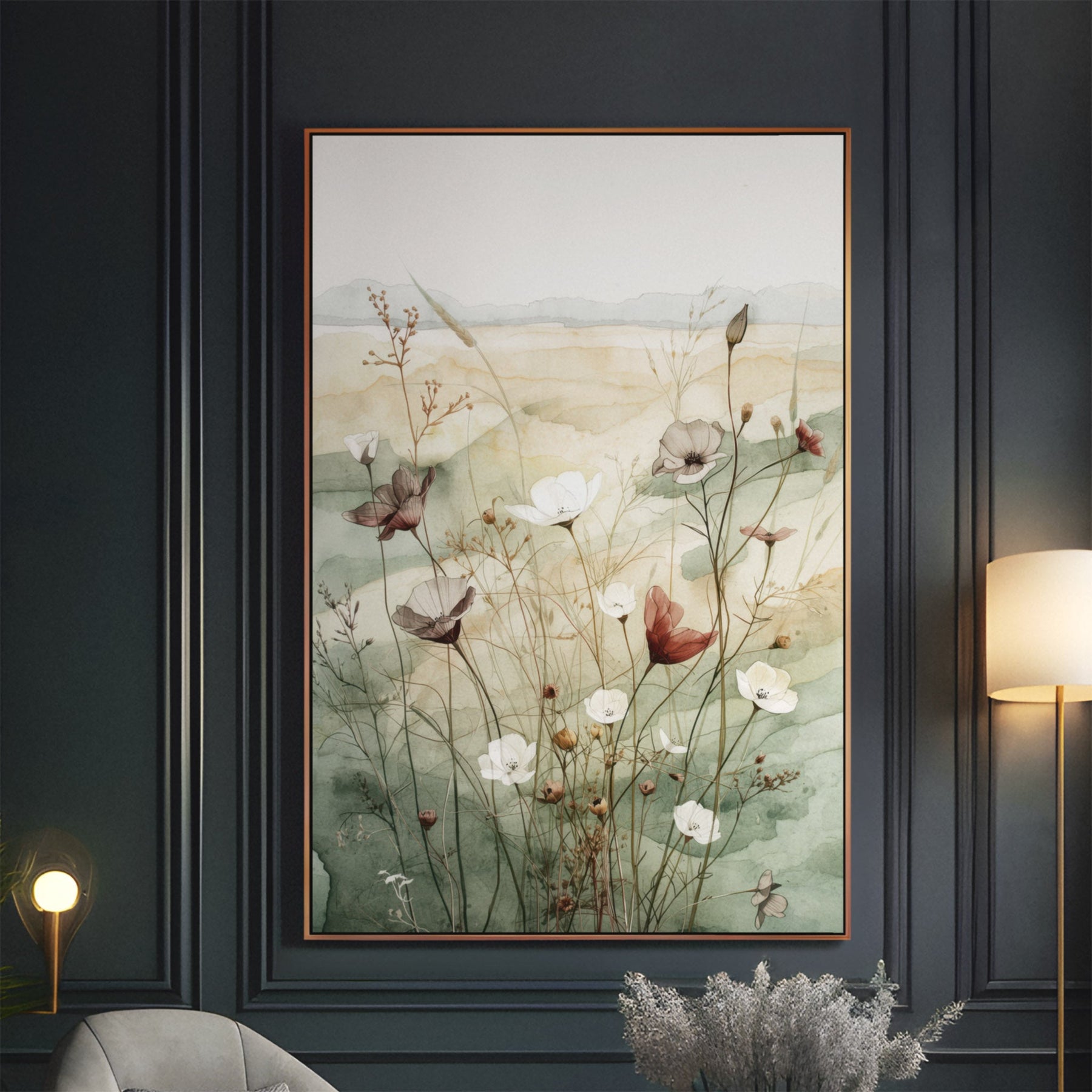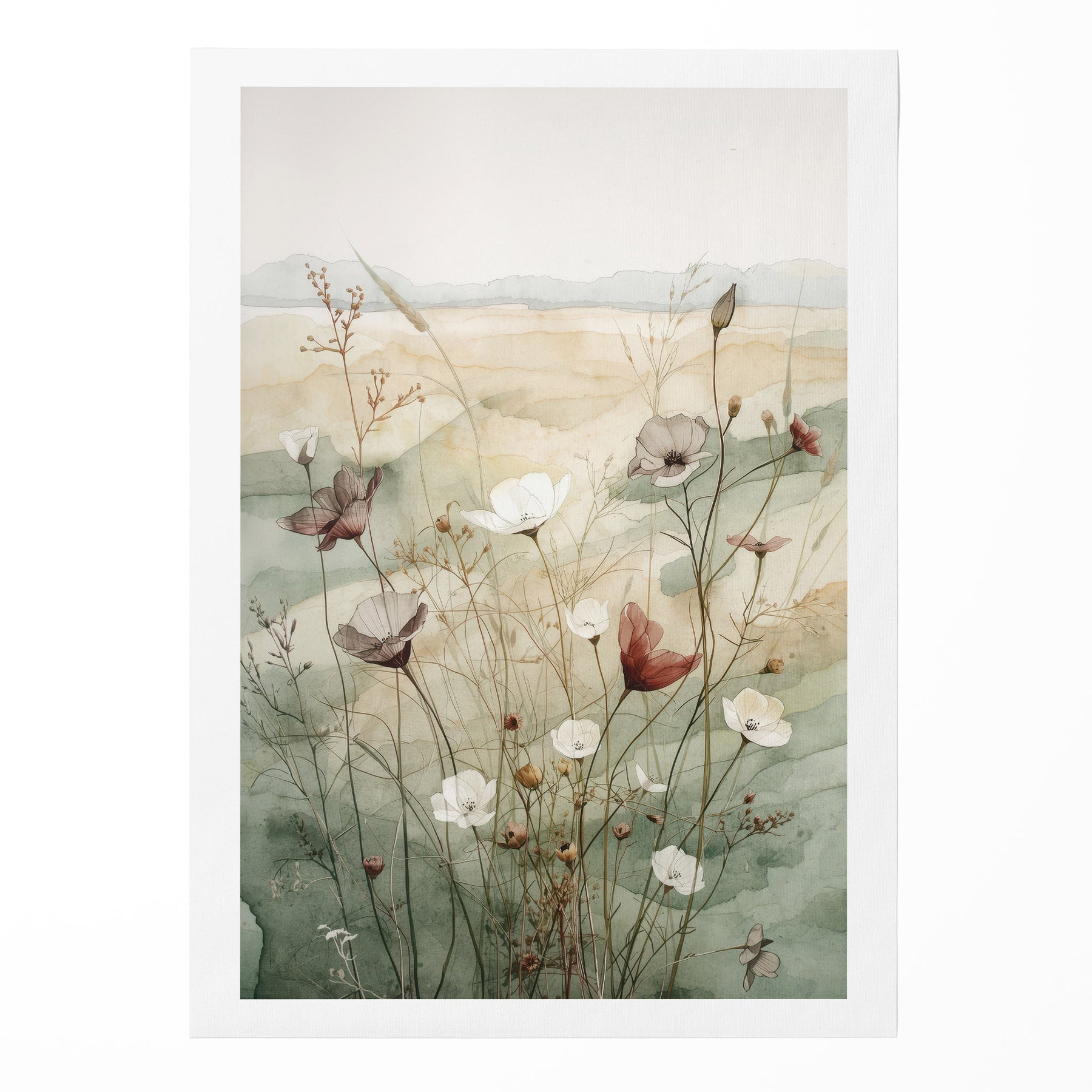 Immerse your space in the tranquil beauty of a wildflower meadow, captured in a delicate watercolor style. A serene palette of sage green, dusty rose, and soft earth tones creates a soothing and ethereal atmosphere. This gallery-grade art print is the perfect centerpiece for a peaceful bedroom, minimalist living room, or calming office space.