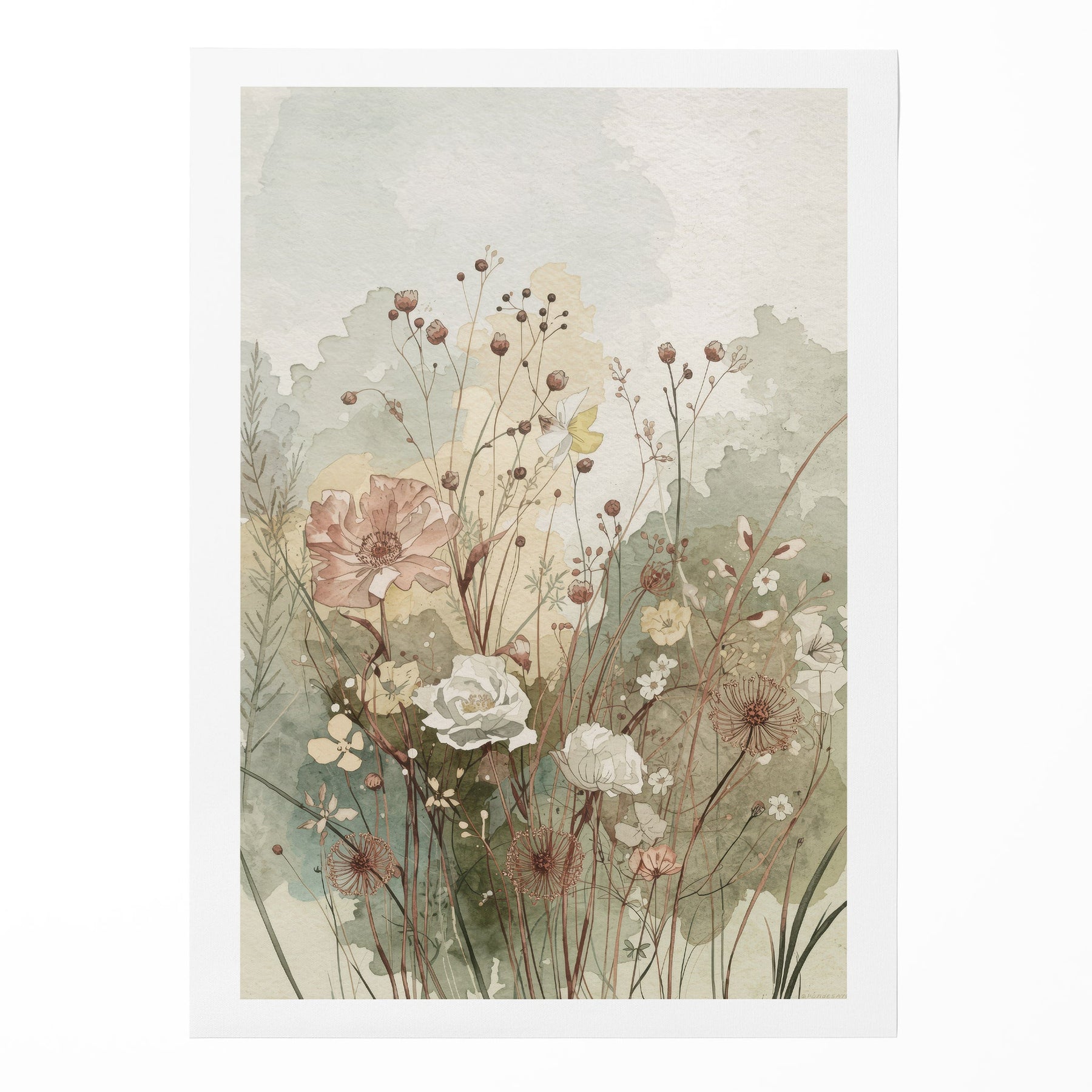Whispering Meadow Grace celebrates the soft light and quiet renewal of nature. Warm neutrals and gentle greens blend across the background, while delicate blossoms rise with a feeling of calm and optimism. The watercolor details are refined yet organic, creating a timeless piece that feels both grounded and uplifting. This artwork completes the Whispering Meadow collection with an elegant, graceful finish.
