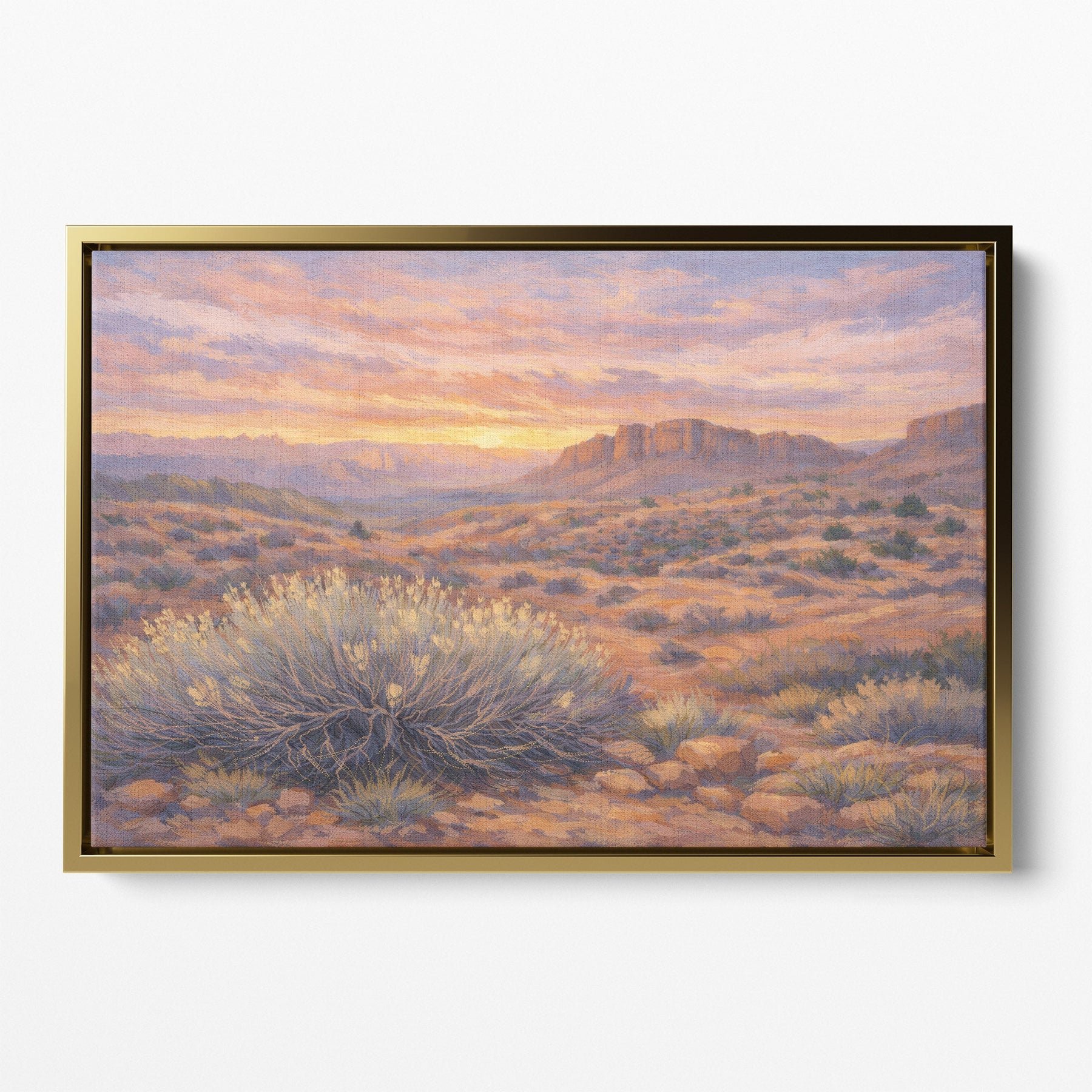 A stretched canvas set within a slim floating frame that reveals a subtle shadow gap around the artwork, enhancing the sense of presence and scale.