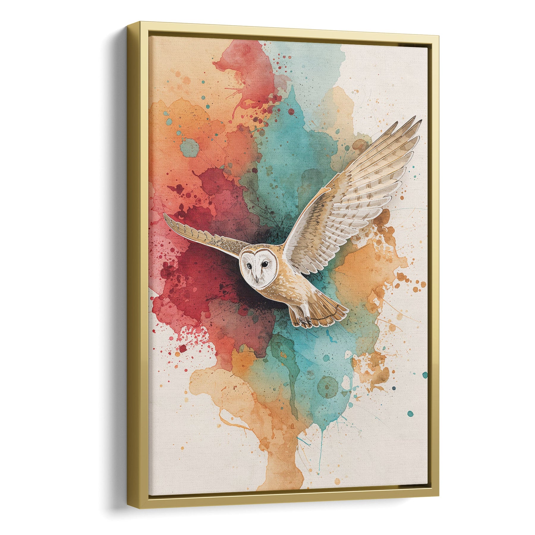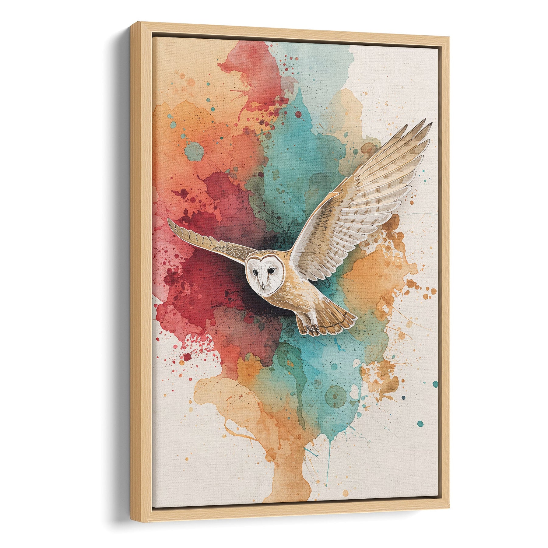 A magnificent barn owl takes flight against a vibrant explosion of abstract watercolor, creating a dynamic fusion of realism and expressive art. The warm, earthy tones of crimson, ochre, and teal create a striking contrast, evoking a sense of wild, untamed beauty. This captivating piece is perfect for adding a touch of sophisticated nature to a modern living room, study, or entryway.