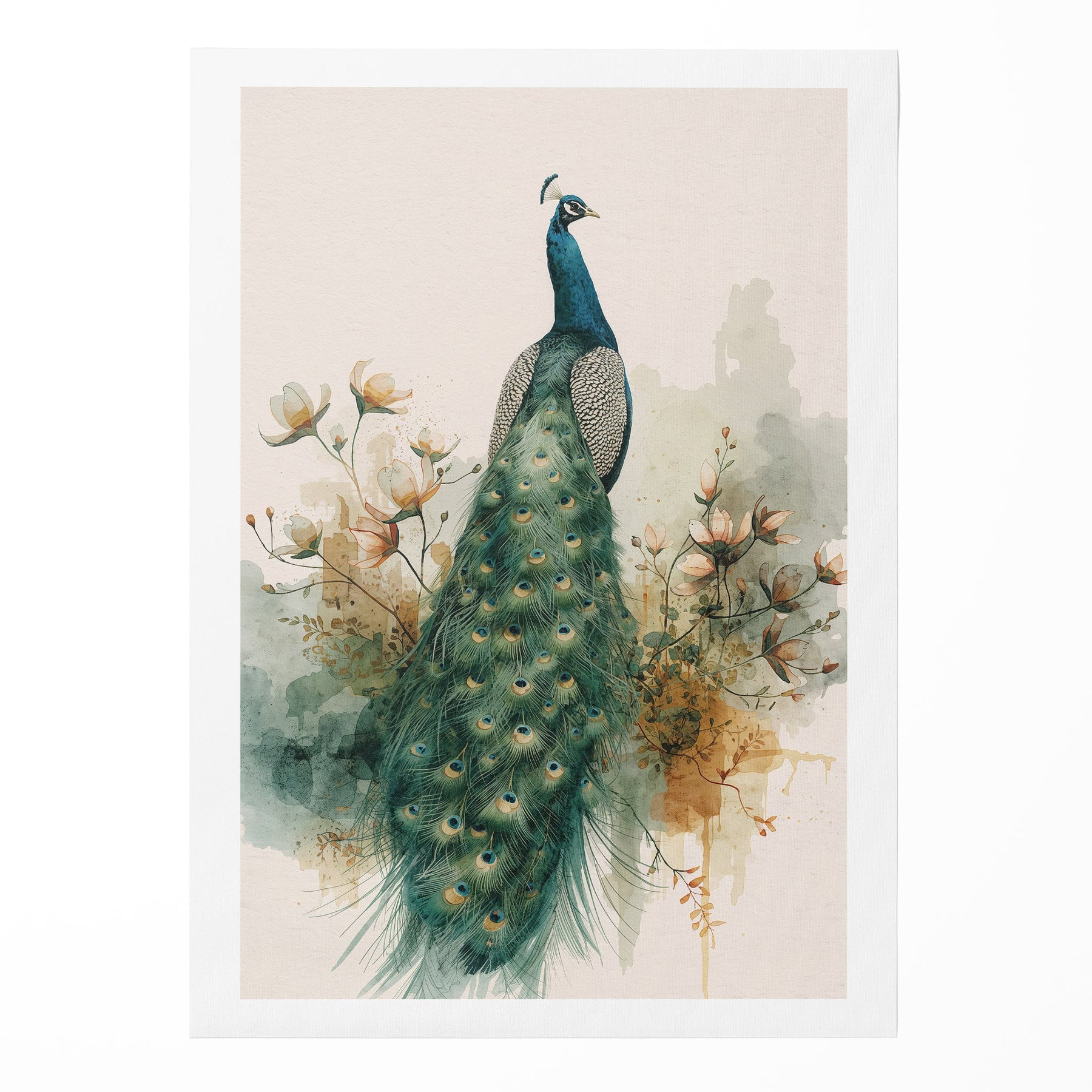 Capture the essence of refined elegance with this stunning watercolor depiction of a majestic peacock. Soft washes of emerald green, deep sapphire, and earthy ochre blend seamlessly to create a serene and sophisticated atmosphere. This captivating piece is the perfect artistic statement for a tranquil living room, bedroom, or study.