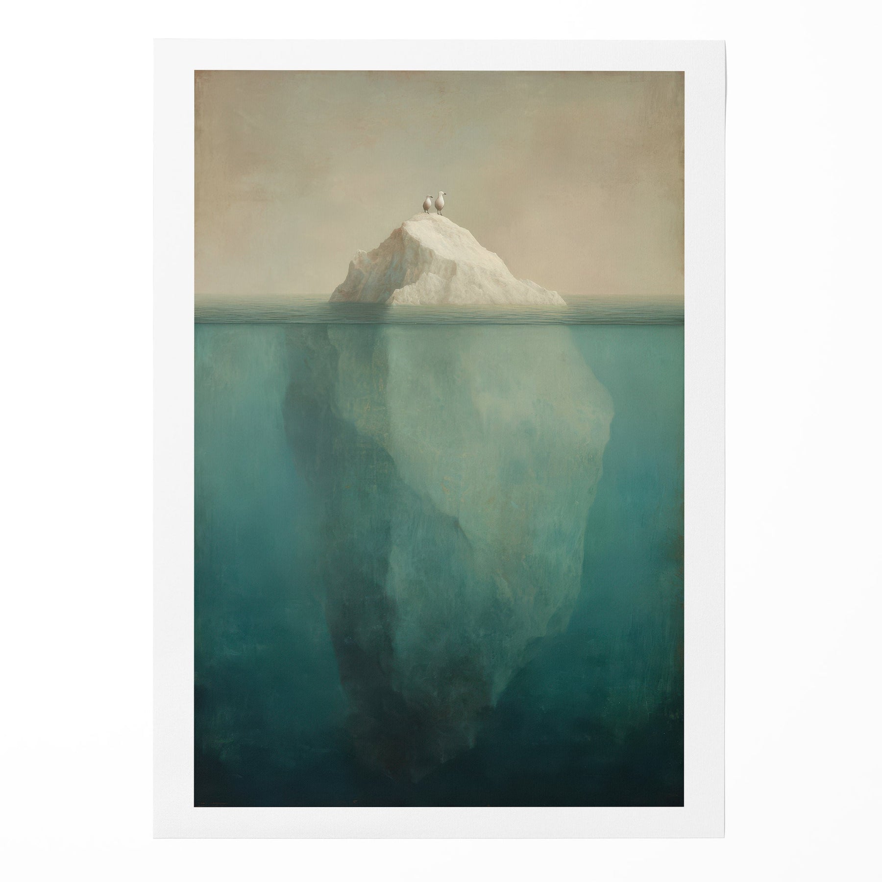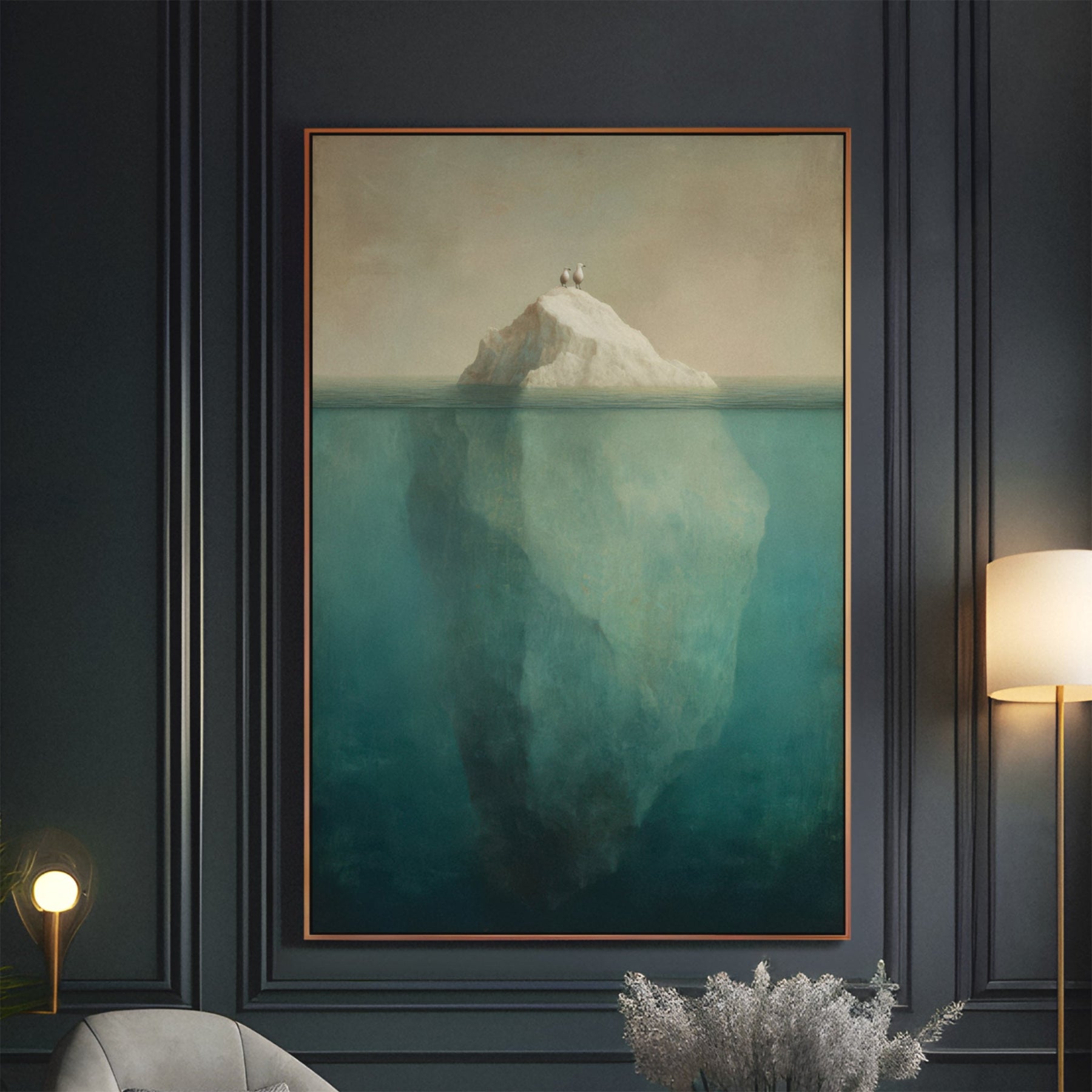 A poetic depiction of an iceberg and its unseen depth, symbolizing mystery, balance, and serenity in cool teal tones.